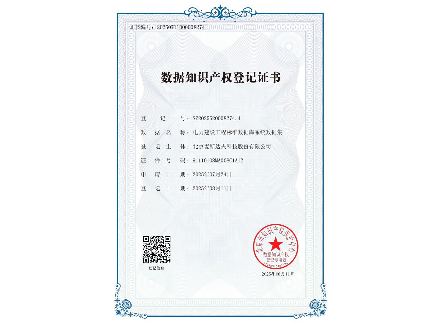 2025年8月11日,麥斯達(dá)夫集團(tuán)在數(shù)據(jù)知識(shí)產(chǎn)權(quán)保護(hù)領(lǐng)域取得突破,旗下“電力建設(shè)工程標(biāo)準(zhǔn)數(shù)據(jù)庫(kù)系統(tǒng)數(shù)據(jù)集”成功獲批“數(shù)據(jù)知識(shí)產(chǎn)權(quán)登記證書(shū)”。這一成果不僅是對(duì)集團(tuán)在標(biāo)準(zhǔn)數(shù)字化領(lǐng)域深耕的肯定,也為能源行業(yè)數(shù)據(jù)資產(chǎn)的保護(hù)和應(yīng)用樹(shù)立了新標(biāo)桿。